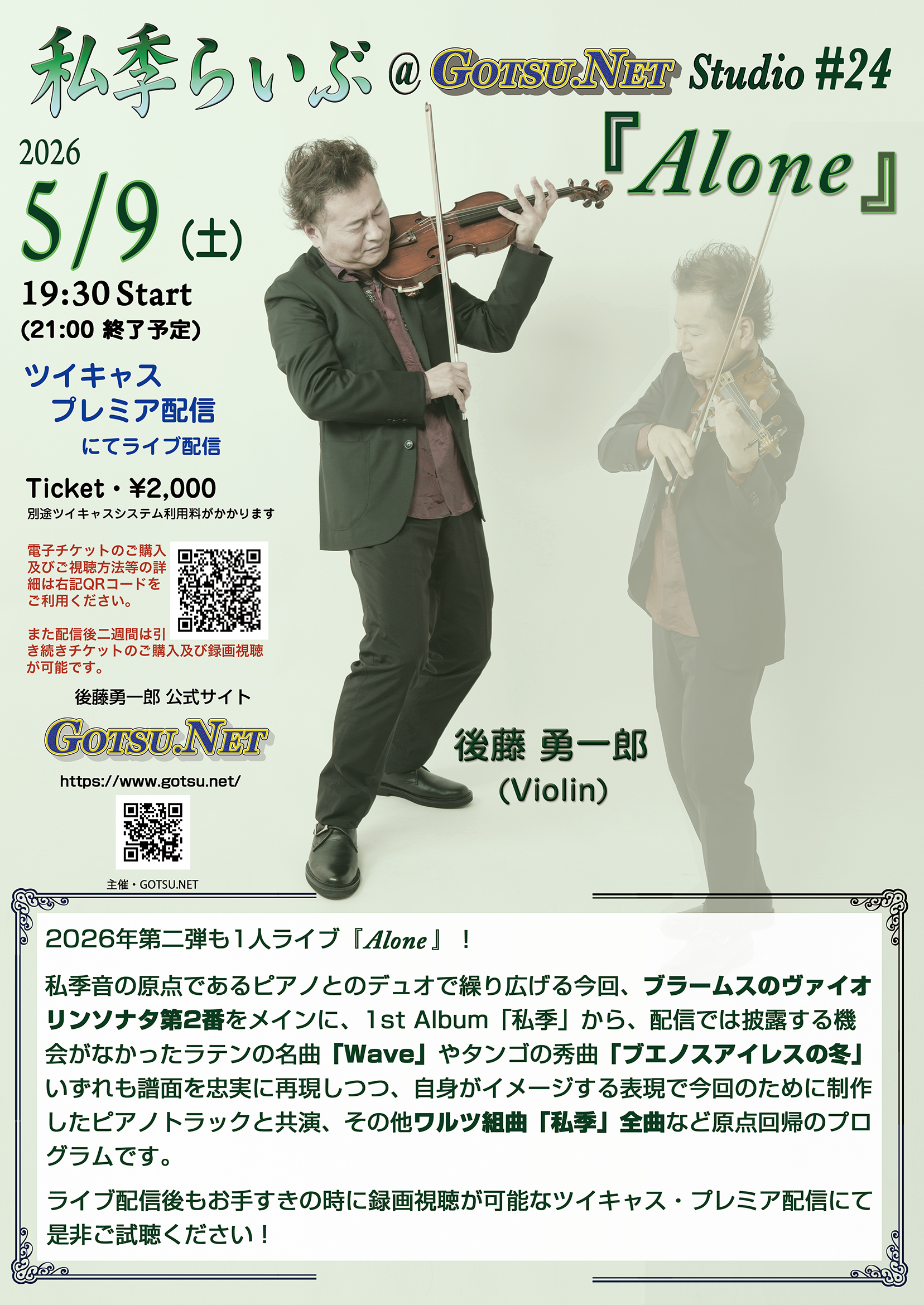 2026年5月9日(土) (ライブ配信終了後5/23(土)までチケットのご購入及び録画視聴が可能です) 私季らいぶ@GOTSU.NET Studio #24『Alone』 ※2026年第二弾も1人ライブ『Alone』! 私季音の原点であるピアノとのデュオで繰り広げる今回、ブラームスのヴァイオリンソナタ第2番をメインに、1st Album「私季」から、配信では披露する機会がなかったラテンの名曲「Wave」やタンゴの秀曲「ブエノスアイレスの冬」、いずれも譜面を忠実に再現しつつ、自身がイメージする表現で今回のために制作したピアノトラックと共演、その他ワルツ組曲「私季」全曲など原点回帰のプログラムです。 ライブ配信後もお手すきの時に録画視聴が可能なツイキャス・プレミア配信にて是非ご試聴ください!