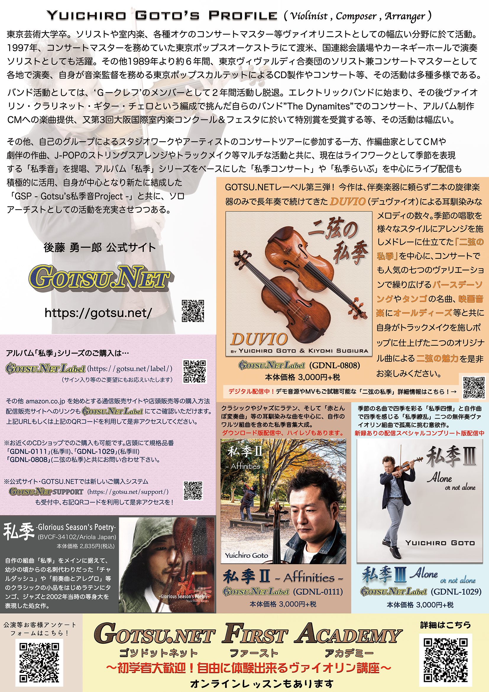 2025年3月15日(土) (ライブ配信終了後3/29(土)までチケットのご購入及び録画視聴が可能です) 私季らいぶ@GOTSU.NET Studio #20『Alone』& The Movie ※節目の20回目は、年初め恒例の1人ライブ『Alone』と共に、昨年10月27日開催の「私季コンサート2024」の模様を合間に挟みながら配信するスペシャルな企画! 無伴奏ヴァイオリンソロやトラックとの共演など、1人で出来る精一杯をライブ演奏で表現しつつ、ドヴォルザークの弦楽五重奏曲をメインに、映画音楽や洋楽ポップスに季節を表現した自作の曲など、会場で奏でた五重奏の響きを録画でお届けします。 ライブ配信後もお手すきの時に録画視聴が可能なツイキャス・プレミア配信にて是非ご試聴ください!